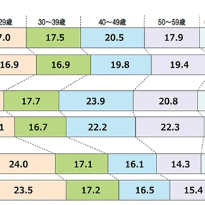 一方、30代‐40代で55.1%から54.1%、50代‐60代で48.8%から47.3%とそれぞれ微減だが、ほぼコロナ禍前の水準に戻っていることがわかる。